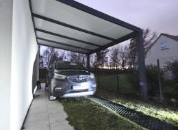Nous avons réalisé les plots béton et raccordé la gouttière au réseau d'eaux pluviales de la maison. La couverture est réalisée en panneaux sandwich.