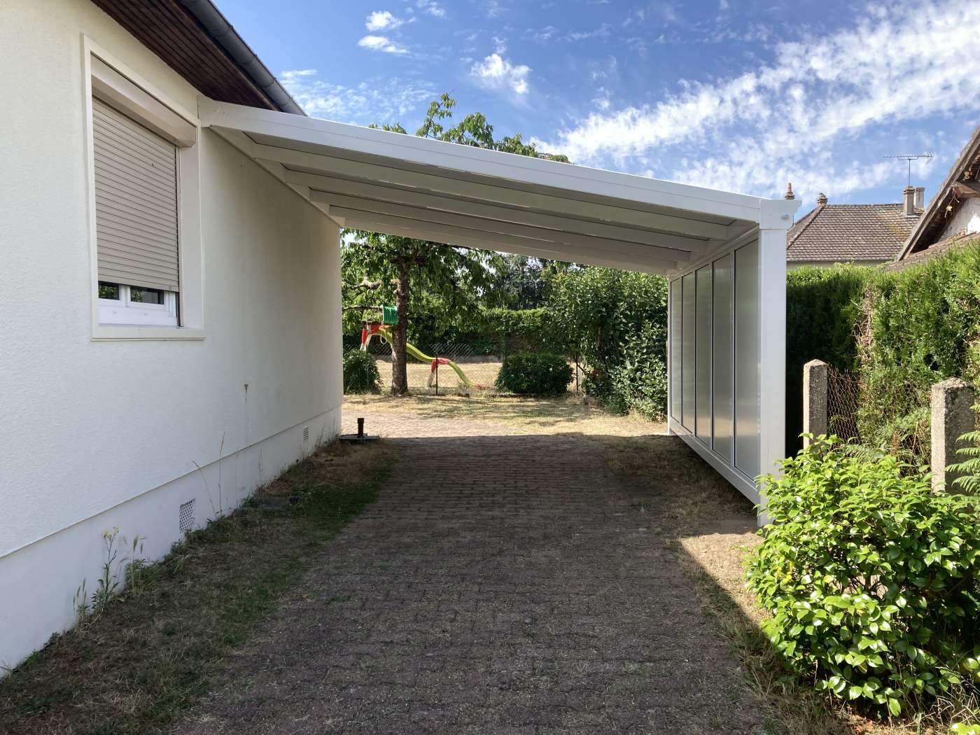 Pour ce Carport posé en limite de propriété, le Plan Local d'Urbanisme imposait de fermer le côté. Nous avons donc réalisé une paroi aluminium toute hauteur qui obture la vue chez les voisins.