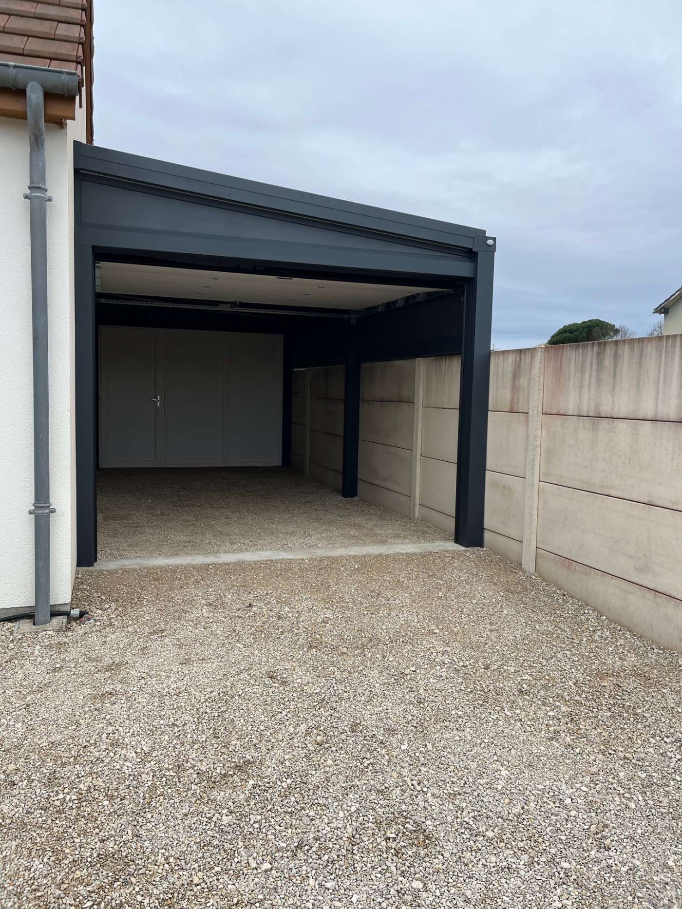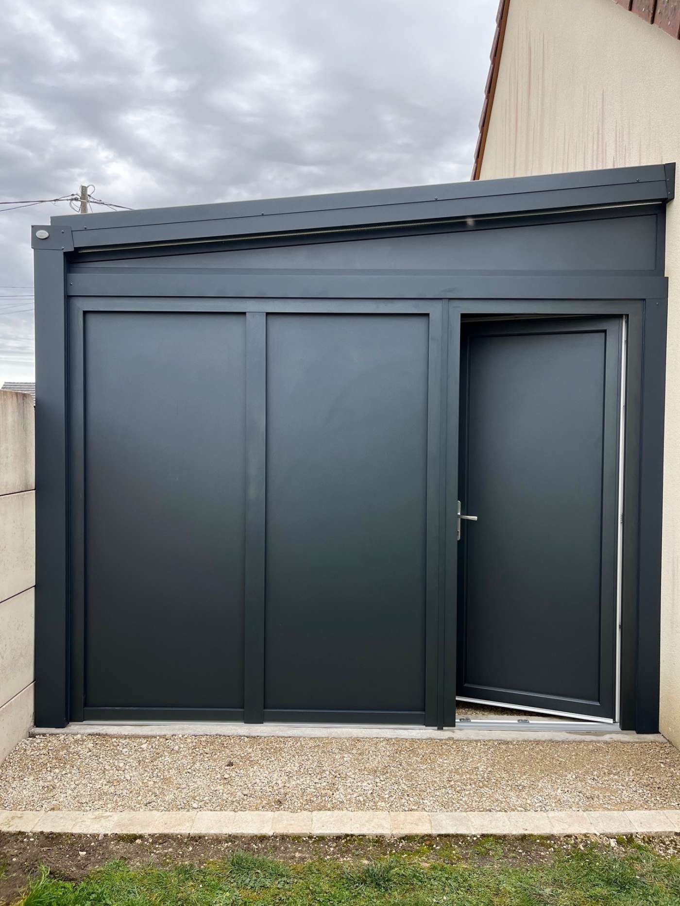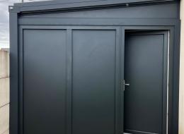 création d'un Carport entièrement fermé, fabrication complète en aluminium gris anthracite.