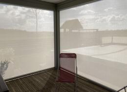 les stores verticaux, tout en transparence, laissent passer une lumière douce et créent un cocon confortable, tout en ménageant la vue sur la nature environnante.
