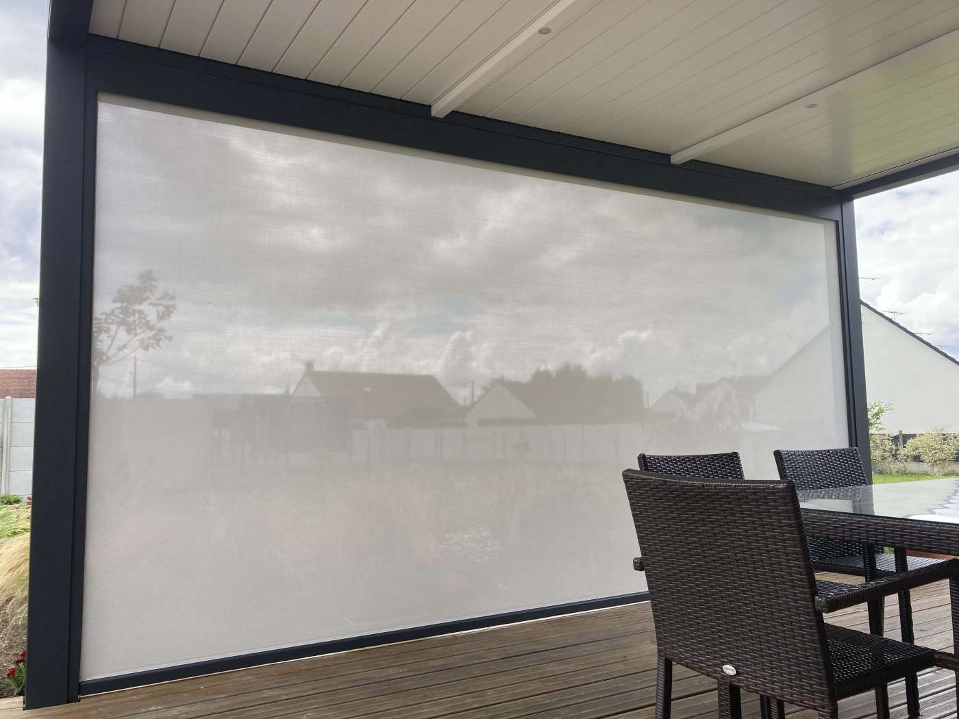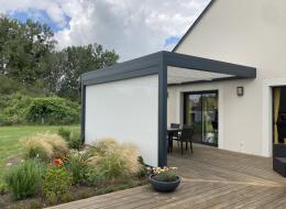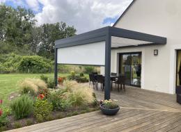 pergola bioclimatique sur terrasse bois avec store en façade posée à Romorantin Lanthenay