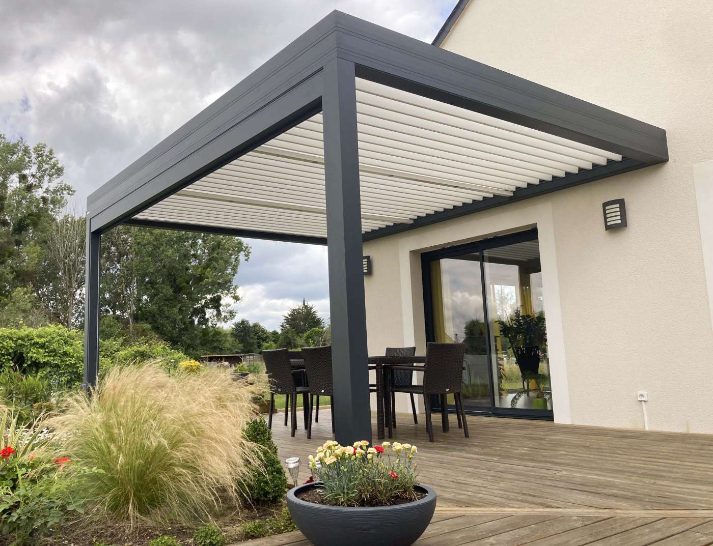 Cette pergola Bioclimatique adossée à cette belle maison contemporaine filtre la lumière et permet une ombre confortable !