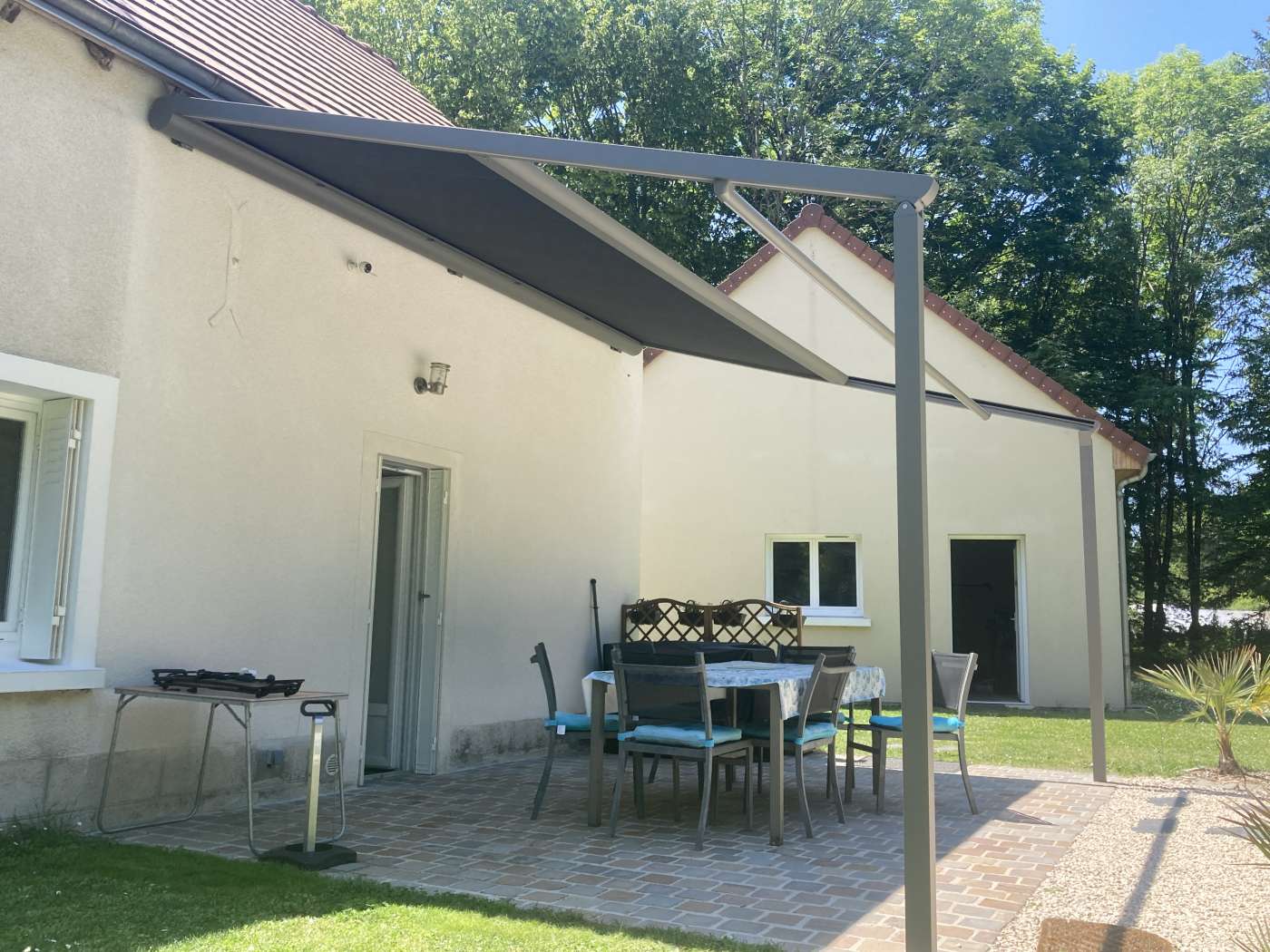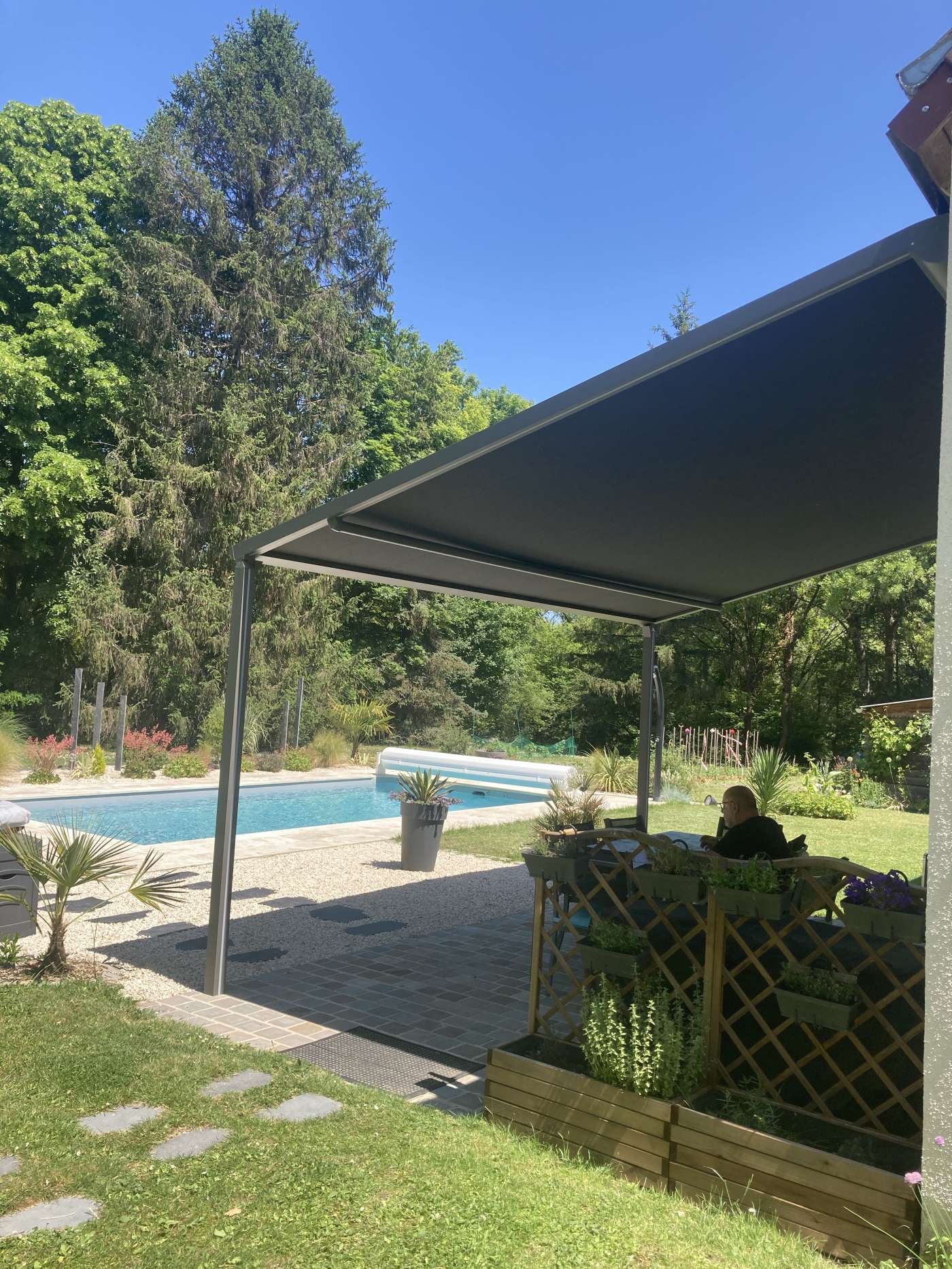 pergola store offrant légèreté, grande résistance au vent, et une ombre généreuse, posée à Selles sur Cher