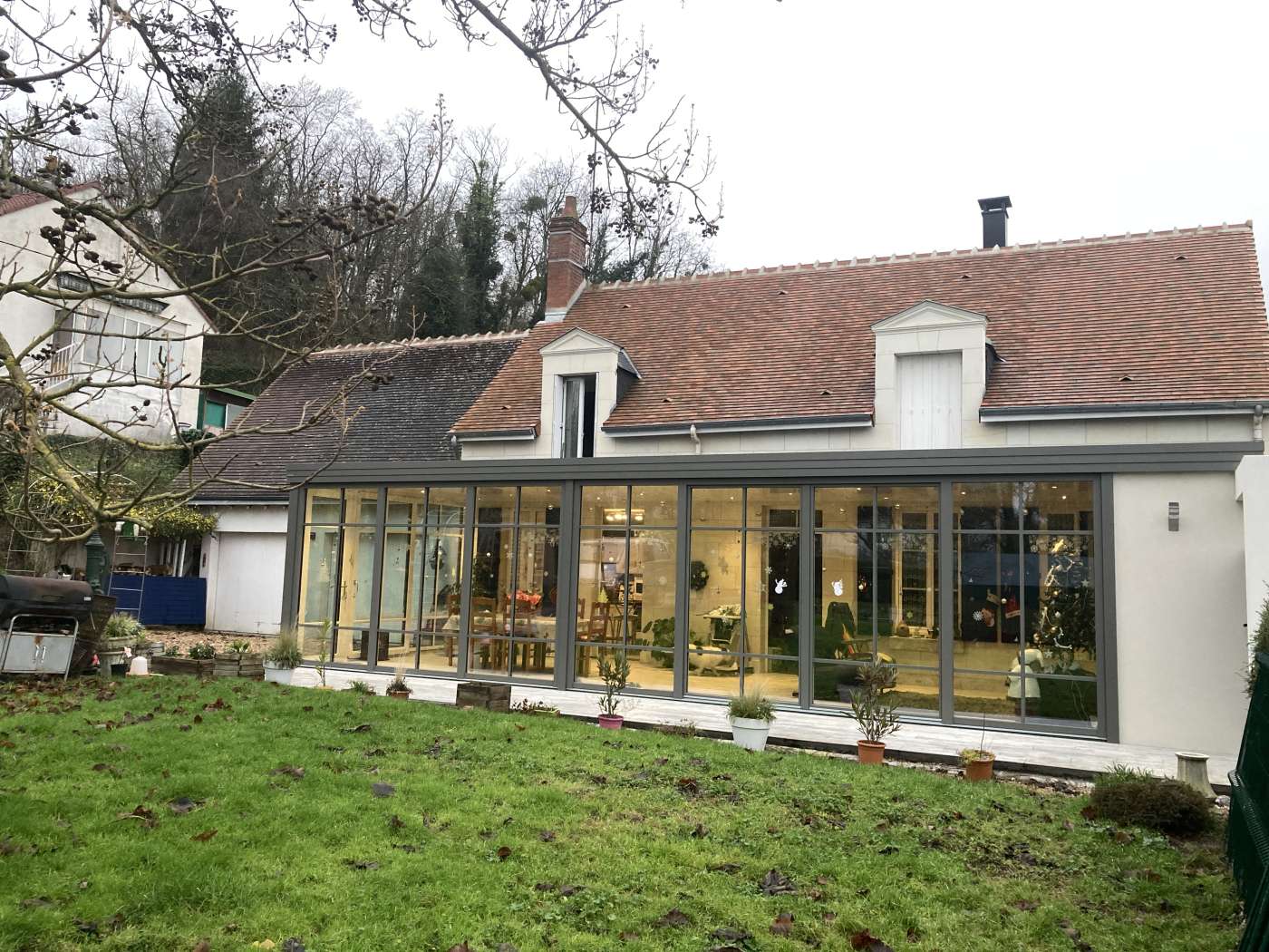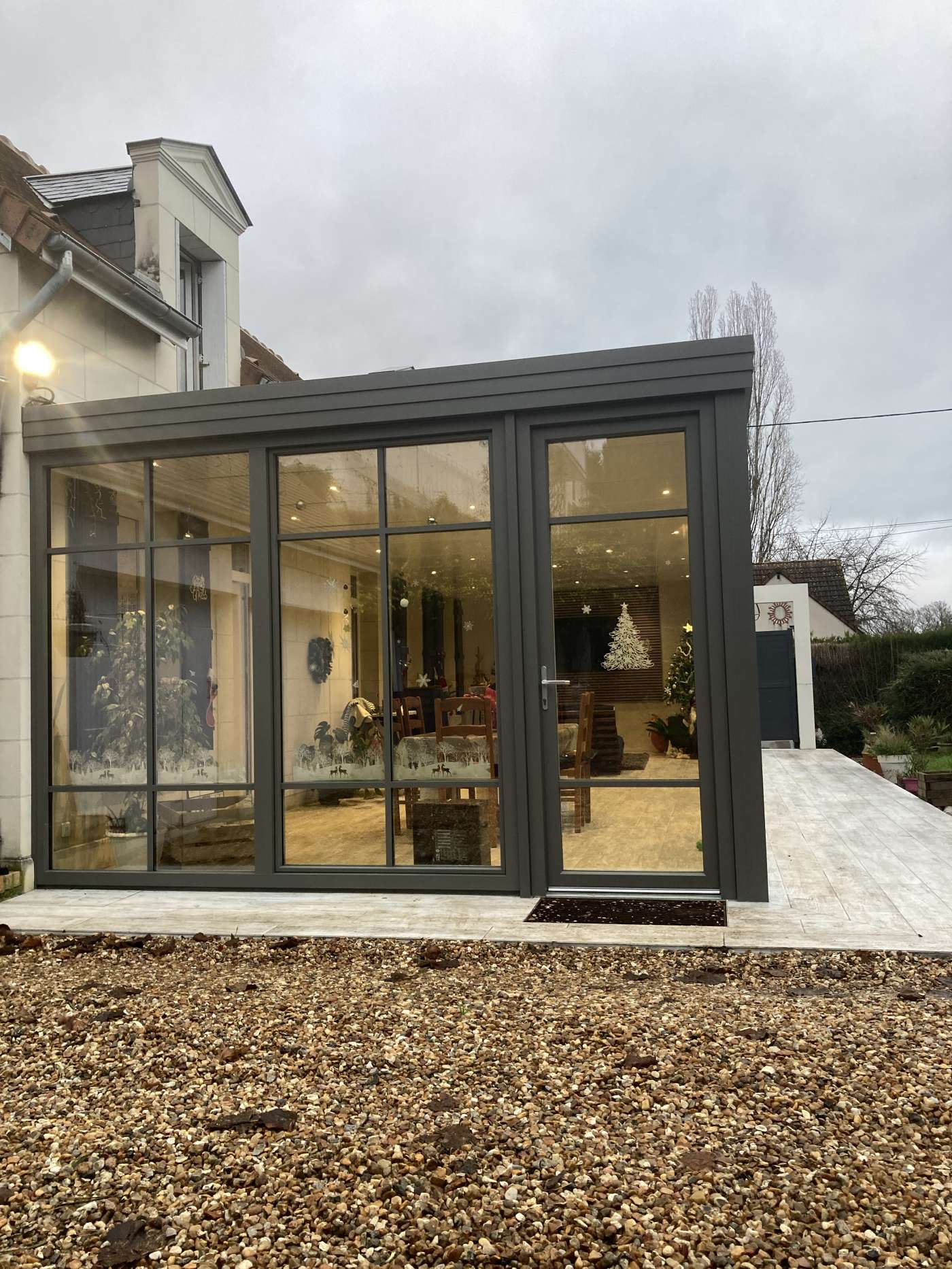 Création d'une véranda aluminium avec toiture plate conçue comme une vraie pièce à vivre ! les matériaux employés isolent du bruit de la route et de du froid.