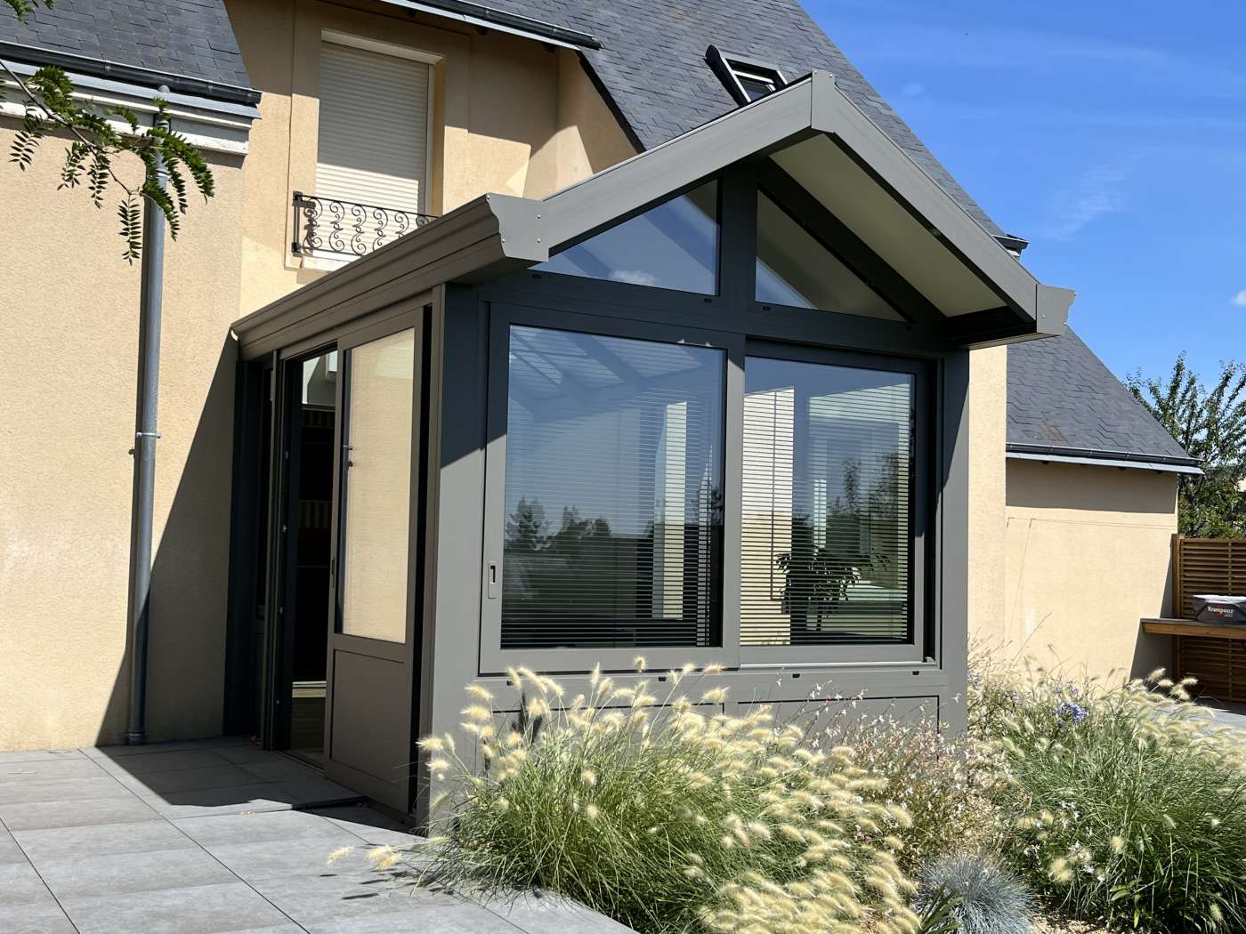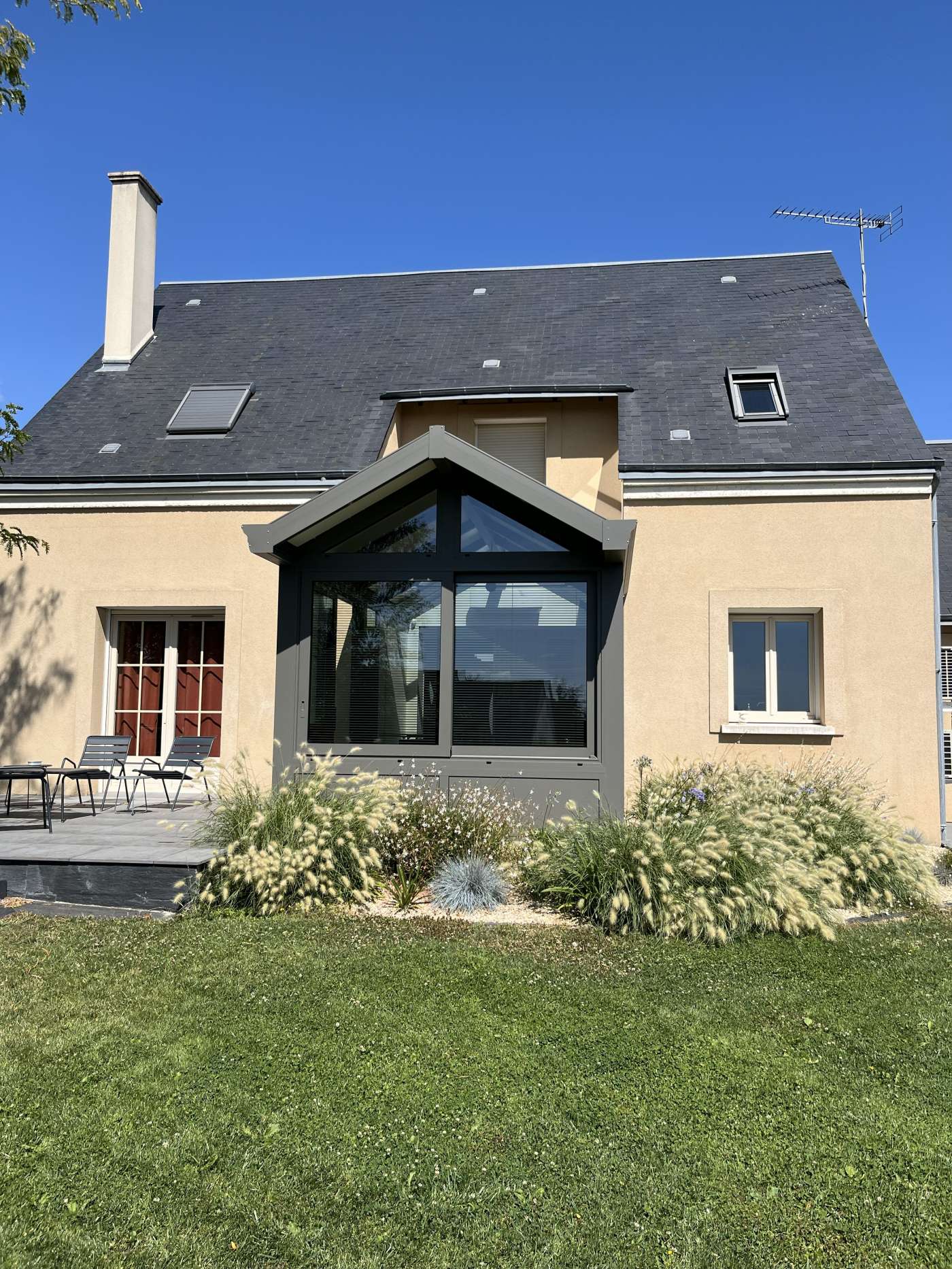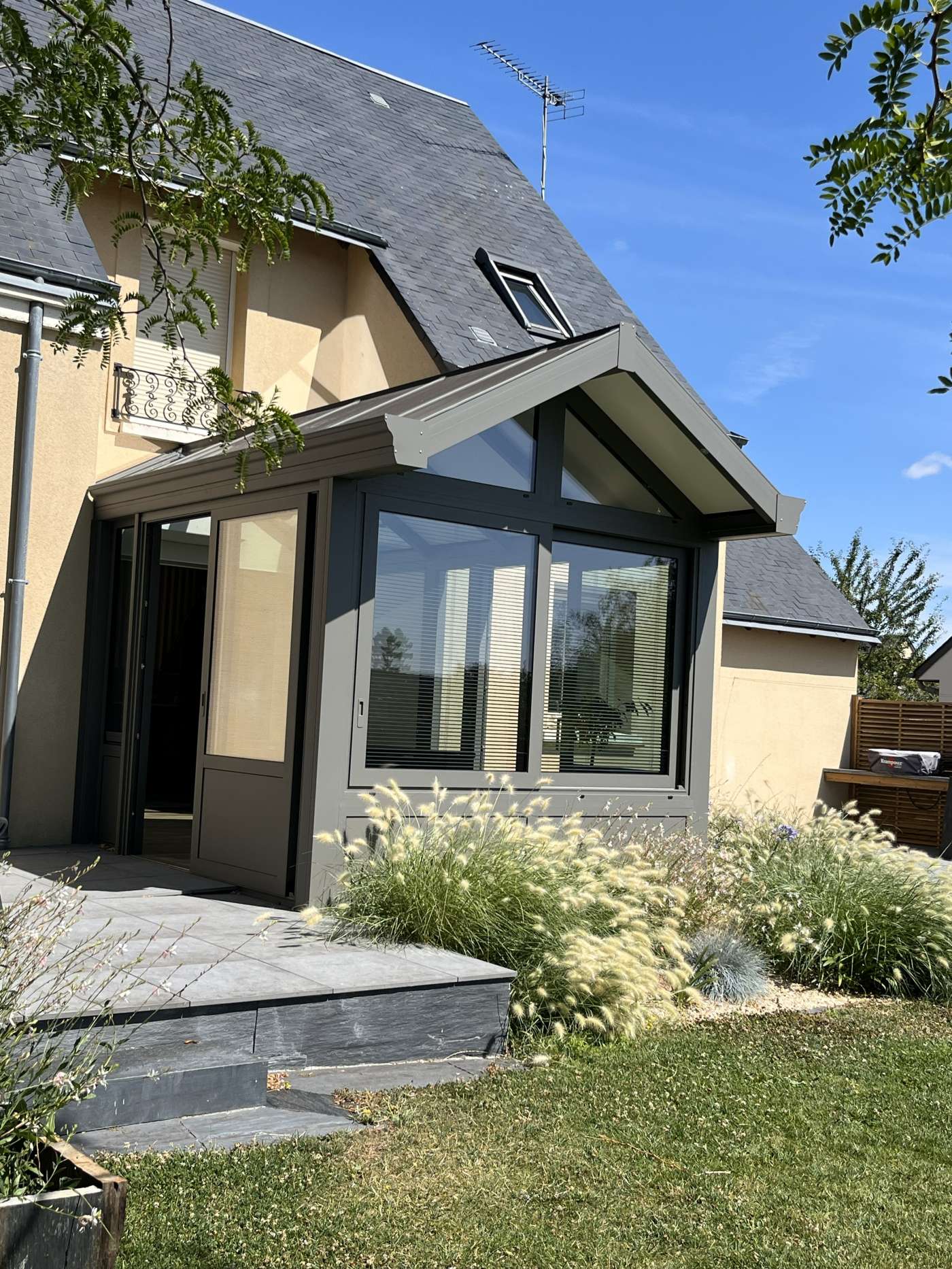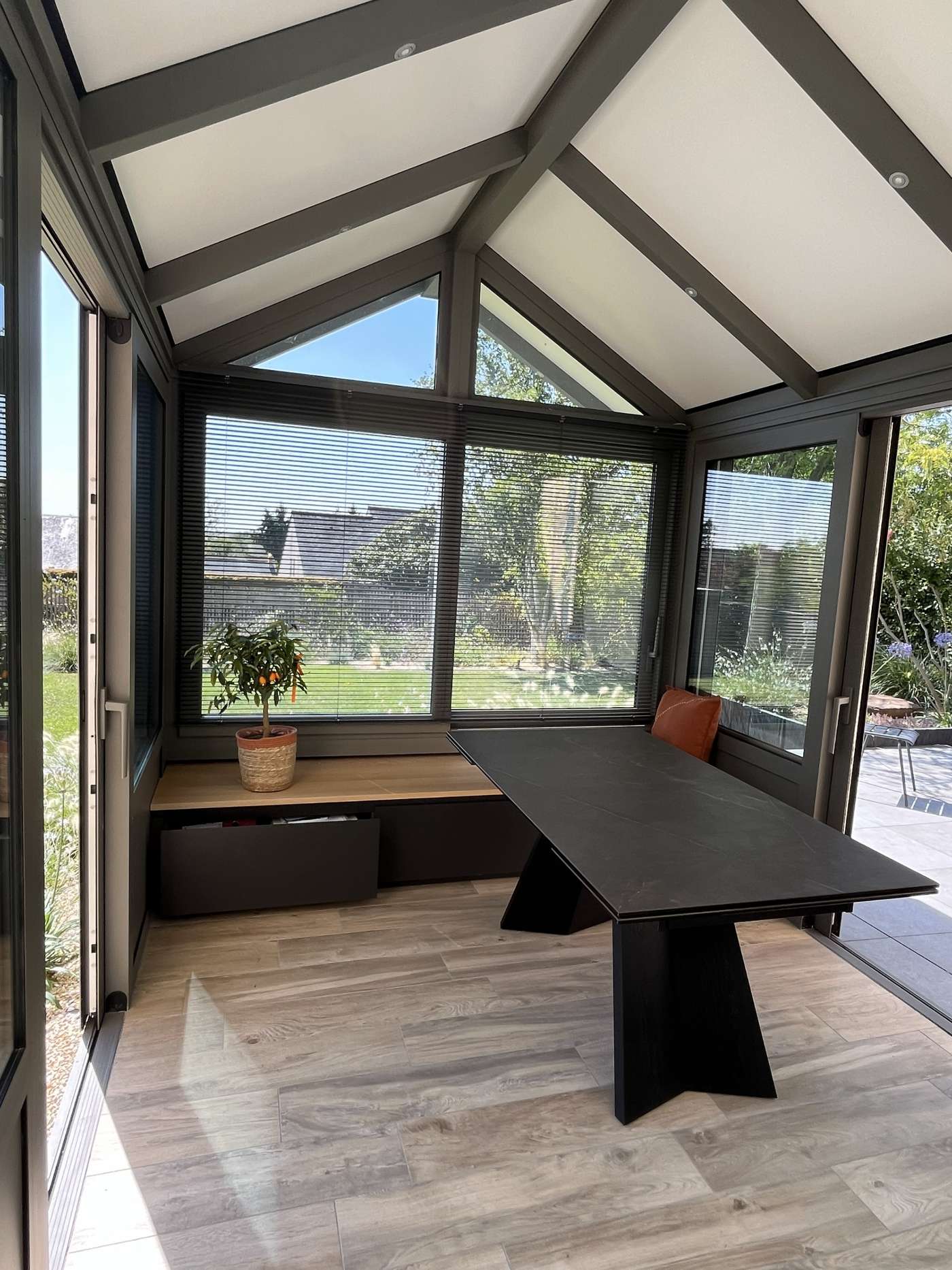 Pour cette véranda prise entre deux murs, nous avons imaginé avec nos clients un projet avec une toiture bi-pente formant une avancée devant la maison. Cela donne un vrai caractère et une originalité à l'ensemble, et s'intègre parfaitement dans le jardin cosy.