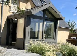 Une véranda qui sort de l'ordinaire : toiture bi-pente avec avancée