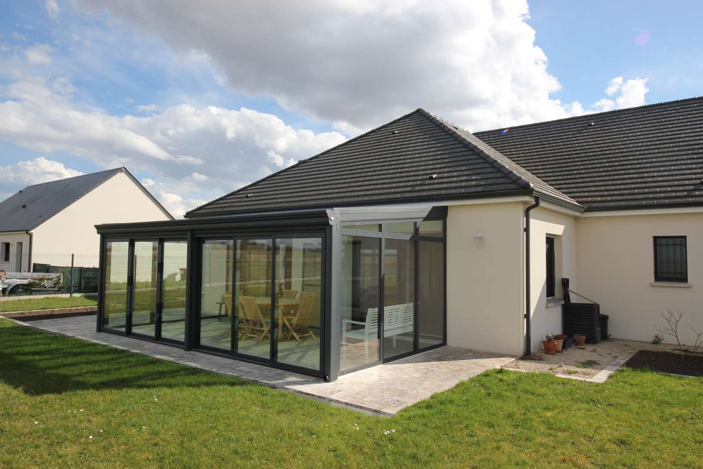Pour cette belle véranda, nos clients souhaitaient profiter d'un maximum de lumière, et surtout de ne rien perdre en luminosité à l'intérieur de la maison.