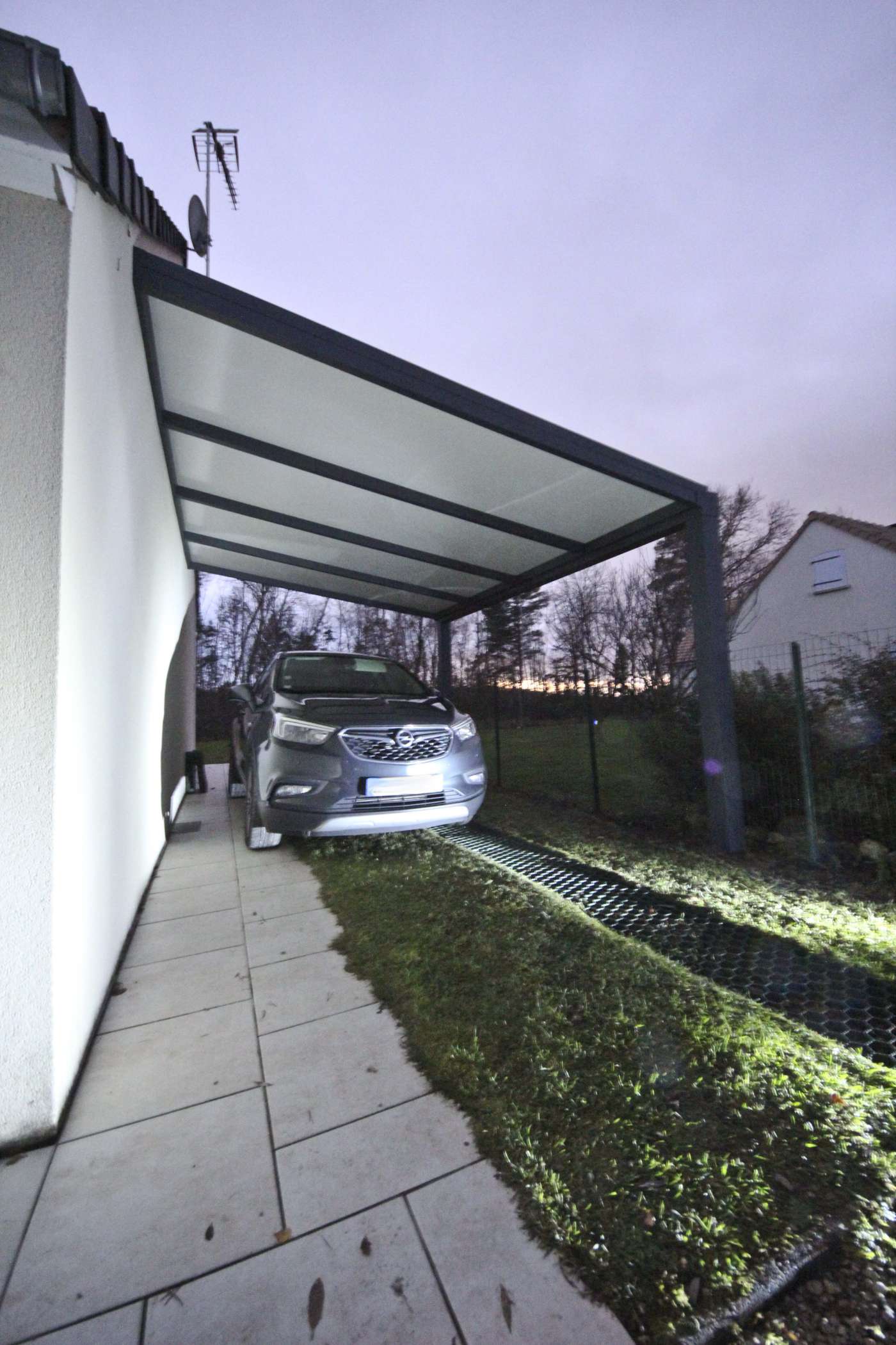 Carport mono-pente implanté sur le pignon d'une maison, posé à Cour-Cheverny à côté de Blois