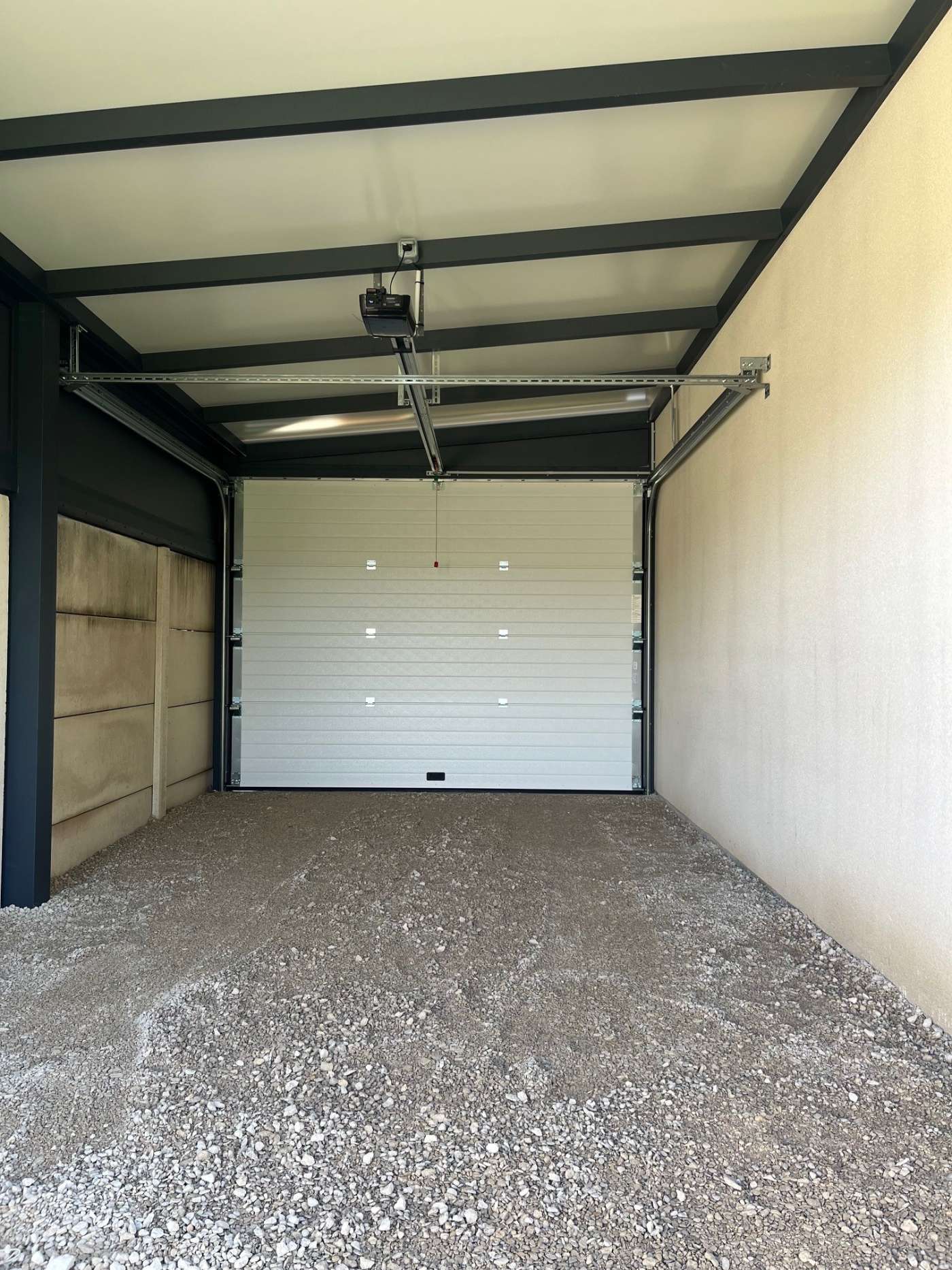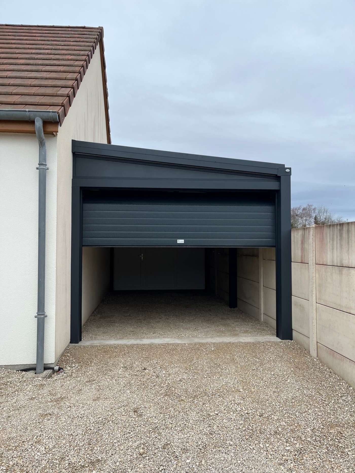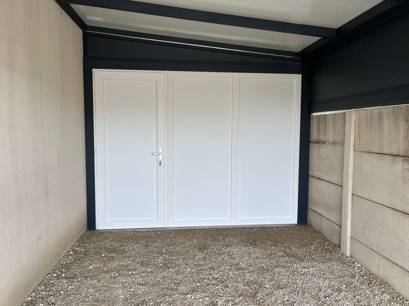 Carport entièrement fermé avec porte de garage sectionnelle et porte de sortie arrière
