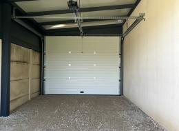 toiture en panneaux isolants, porte de garage sectionnelle motorisée, et fermeture arrière par une menuiserie comportant deux panneaux isolants fixes et une porte de service.