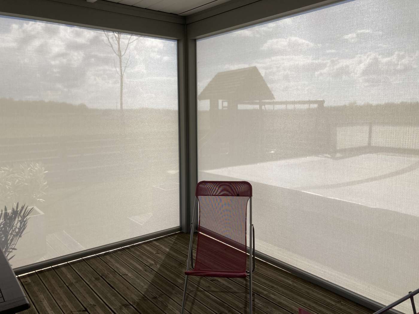 les stores verticaux, tout en transparence, laissent passer une lumière douce et créent un cocon confortable, tout en ménageant la vue sur la nature environnante.