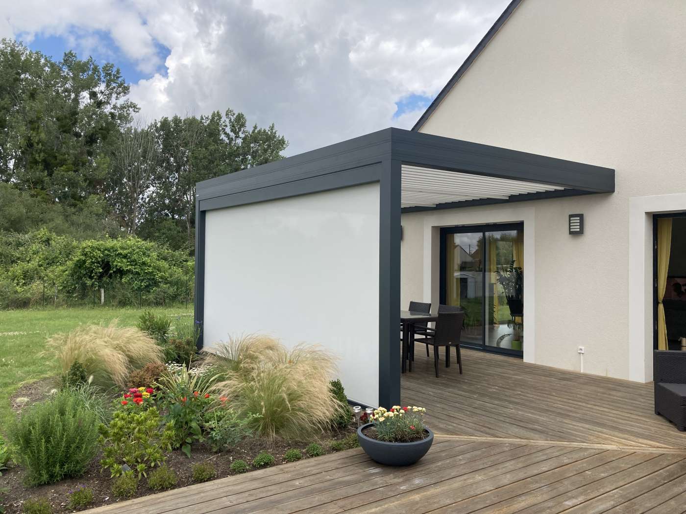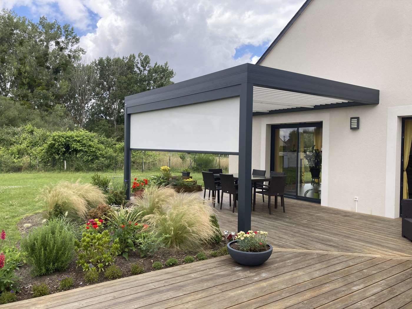 pergola bioclimatique sur terrasse bois avec store en façade posée à Romorantin Lanthenay