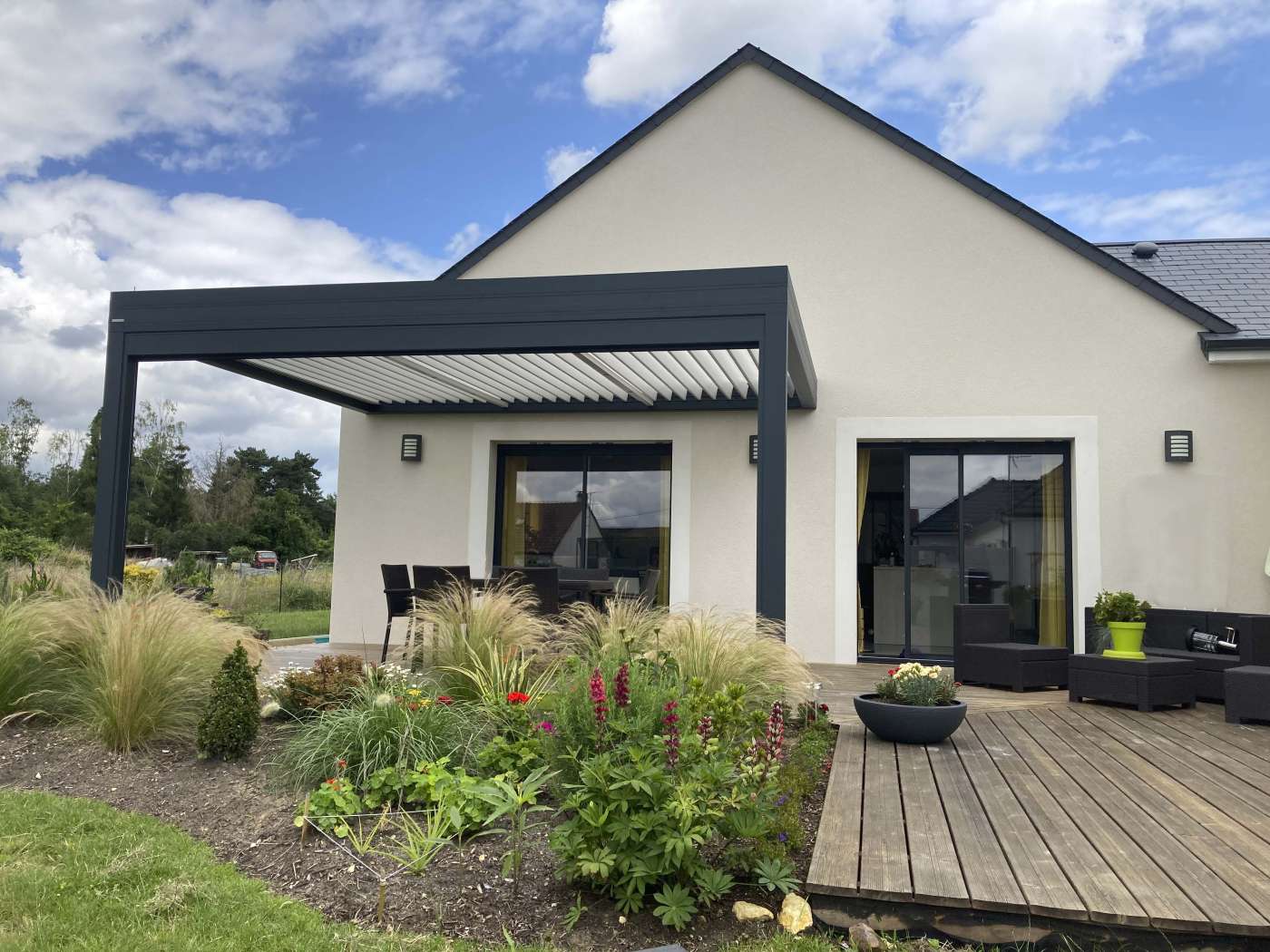 Cette pergola Bioclimatique adossée à cette belle maison contemporaine filtre la lumière et permet une ombre confortable !