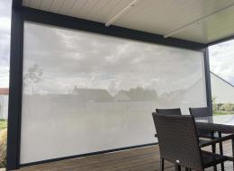 Le store en façade, toujours équipé d'une toile Sergé micro perforée est très résistante : zippée dans les coulisses latérales, elle est quasi indéchirable, résiste très bien au vents et aux aléas de la vie, et est très facile d'entretien.