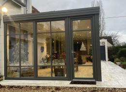 Création d'une véranda aluminium avec toiture plate conçue comme une vraie pièce à vivre ! les matériaux employés isolent du bruit de la route et de du froid.