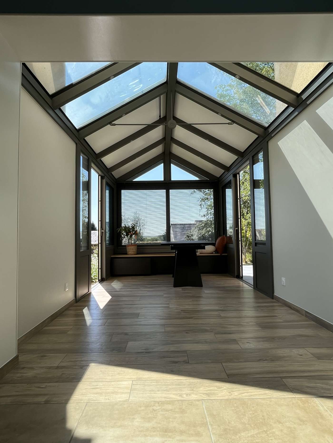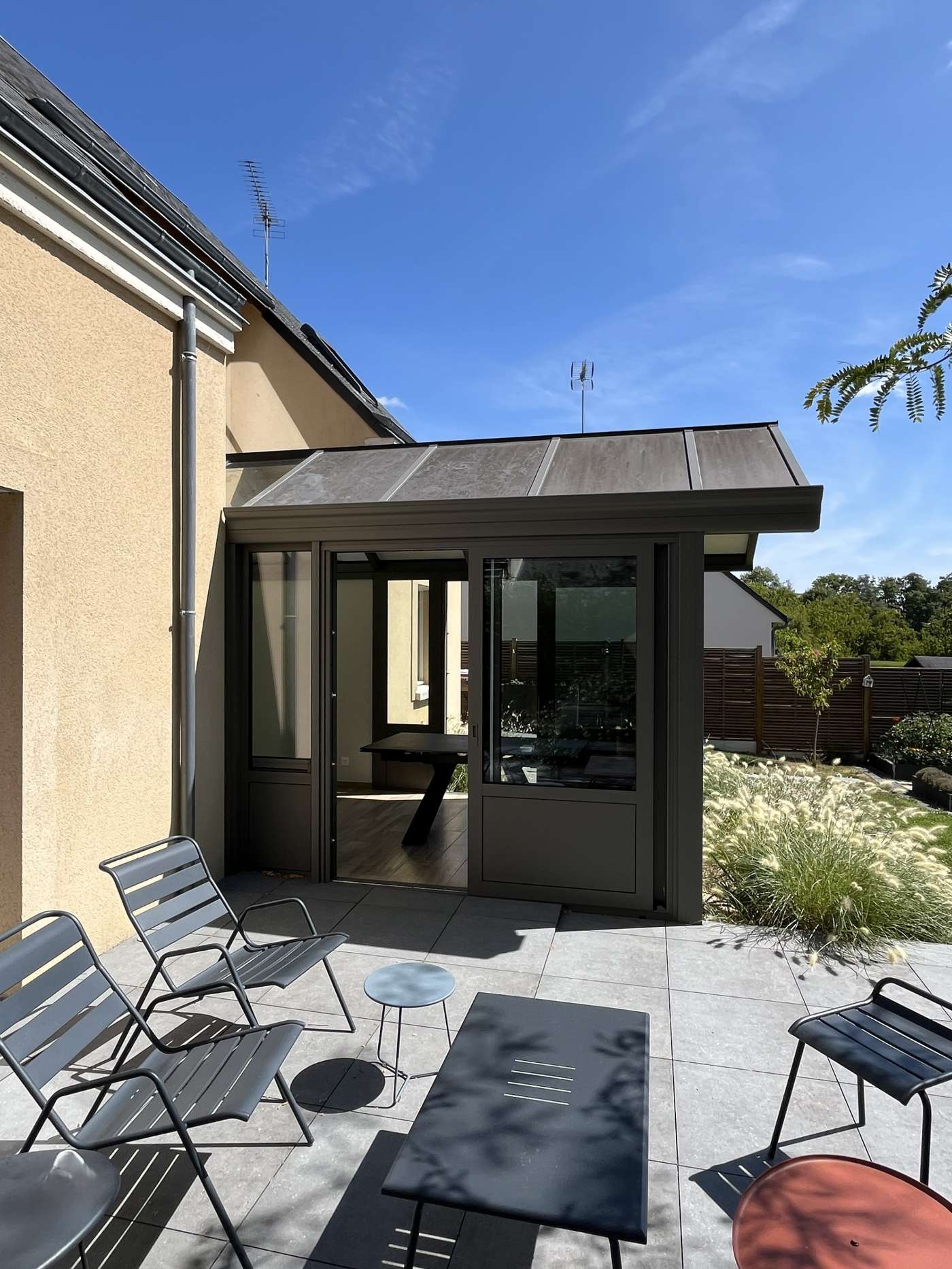 Pour cette véranda prise entre deux murs, nous avons imaginé avec nos clients un projet avec une toiture bi-pente formant une avancée devant la maison. Cela donne un vrai caractère et une originalité à l'ensemble, et s'intègre parfaitement dans le jardin cosy.