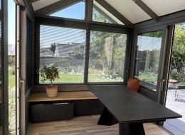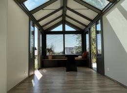 La véranda est fabriquée en aluminium, avec panneaux sandwich et puits de lumière triple vitrage en toiture. L'ensemble des menuiseries sont bien sûr à rupture de pont thermique, pour assurer confort et bien-être aux habitants.