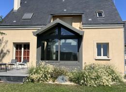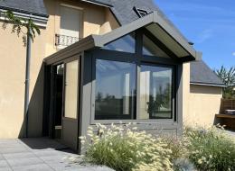Une véranda qui sort de l'ordinaire : toiture bi-pente avec avancée